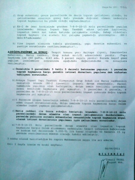 Son çare olarak 5 numarada bulunan 5 katlı binanın sakinleri mahkemeye müracaat ederek durumun tespit edilmesini ve gerekli önlemlerin alınmasını talep etti. İnşaat çalışmasının bulunduğu alanda ve çevrede inceleme yapan bilirkişi heyeti, inşaat nedeniyle 5 numarada bulunan binanın duvarlarında, kolonlarında ve kirişlerinde çatlakların meydana geldiğini, ayrıca yakındaki parsellerde bulunan diğer binalarda da toprak kaymasına bağlı olarak çatlakların meydana geldiğini, inşaata bitişik yolda da derin çatlakların meydana geldiğini tespit ederek, firma yetkililerinin dolgu zeminde toprak kaymasına karşı önlem almadan inşaat yapmaya çalıştıklarını, ayrıca inşaat alanında tabela görülmediği, yapı denetim mühendisi ve şantiye sorumlusuna da rastlanmadığı yönünde hazırladığı raporu Kartal 2. Sulh Ceza Mahkemesi’ne sundu.