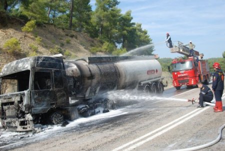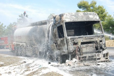 Akaya, “Seyir halindeyken lastiğin yanmaya başladığını fark edince hemen tankeri durdurup söndürmeye çalıştım. Ama kısa sürede alevler kamyonun tamamını sardı. Çok şükür itfaiye ekipleri yetişerek yangını söndürdü. Büyük bir facia da bu şekilde önlendi.” dedi.