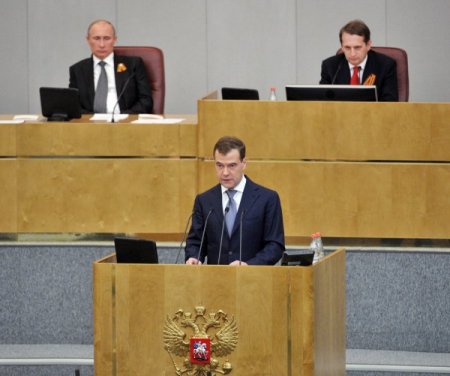 Ülkenin modernizasyonu çerçevesine yaptığı çalışmaları anlatan Medvedev, ekonomik kriz sürecinden başarılı bir şekilde çıkıldığını söyledi. Medvedev yeni dönemde ekonomik, siyasi, kültürel ve enerji alanında programını sundu ve Duma’da bulunan siyasi partilerin sorularını cevapladı. Siyasi parti temsilcilerinin konuşmalarının ardından genel kurulda oylamaya geçildi.