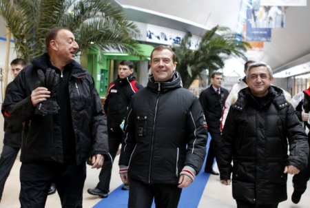 Rusya’nın Karadeniz tatil kenti Soçi’de bir araya gelen Rusya Devlet Başkanı Dmitri Medvedev, Azerbaycan Cumhurbaşkanı İlham Aliyev ve Ermenistan Cumhurbaşkanı Serj Sarkisyan üçlü zirvenin ardından karın tadını çıkardı. Üç lider birlikte karın altında yürüdükten sonra Sarkisyan ayrılırken, Aliyev ve Medvedev birlikte kayak yaptı.