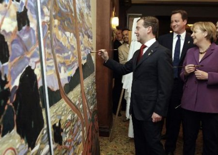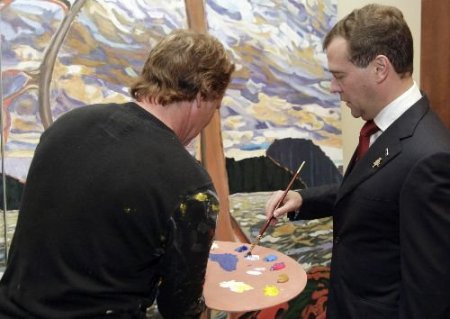 Zirve çerçevesinde salonda asılı dev tabloya yaklaşan Medvedev eline fırça alarak resime katkıda bulundu. Salonda bulunan görevli ressam da boya ve fırça tercihinde Medvedev'e yardımcı oldu.