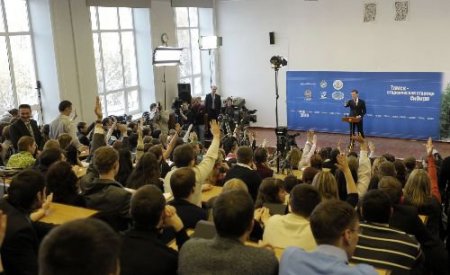 Ülkenin Tomsk kentinde üniversite öğrencileri ile bir araya gelen Başkan Medvedev samimi itiraflarda bulundu. Rusya'nın en köklü eğitim kurumu sayılan Tomsk Politeknik Üniversitesi'nde gerçekleştirilen buluşmada Medvedev, "Ben uzun yıllar, daha doğrusu on yıl bir eğitim kurumunda ders verdim. Ders vermeyi severim. Ama bugün burada ders vermeyeceğim." diye espri yaptı.