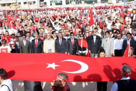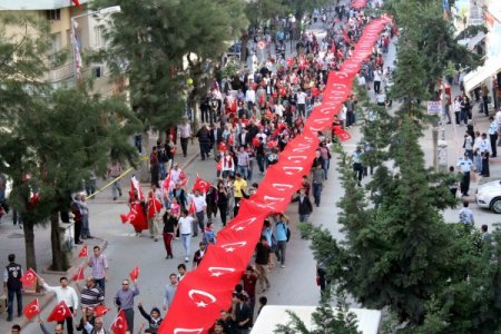 Toroslar ilçesi Anıt Kavşağında toplanan vatandaşlar Hastane caddesini takip ederek Metropol miting alanına geldi. Yaklaşık 500 metre uzunluğunda Türk Bayrağı açan vatandaşlar terör örgütü aleyhine slogan attı. Şehitlere saygı teröre lanet yürüyüşü ve mitingiyle son günlerde yaşanan terör olayları protesto edildi.