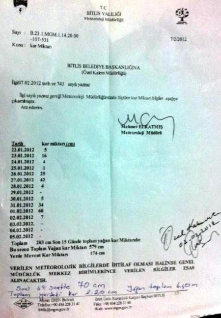 Bitlis’in kar kalınlığı 6 metre 40 santim olarak belgelendi. Bitlis Meteoroloji Müdürlüğü resmi olarak belgelendirdiği Bitlis’teki kar kalınlığını 6 metre 40 santim olarak tespit etti. Yerdeki kar miktarını 2 metre 20 santim olarak belirleyen Bitlis Meteoroloji Müdürlüğü bu sezon yağan toplam kar kalınlığını ise hazırladığı resmi belgede 6 metre 40 santim olarak ölçtü. Yağan karın kalınlığına ve ağırlığına dayanamayan Bitlis’in bazı eski tarihi evleri, Bitlis Emniyet Müdürlüğü'ne ve Güroymak Yatılı Bölge Okulu (YİBO)'na ait 2 kapalı halı saha üzerlerine biriken kardan dolayı çöktü.