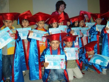 Erzin’de okul öncesi eğitimi alan Ülfet Hüseyin Göktekin Anaokulu öğrencileri, mezun olmanın sevincini yaşadı. Öğrencilerin mezun olması nedeniyle Erzin İmam Hatip Lisesi salonunda düzenlenen mezuniyet töreni büyük ilgi gördü. Öğrencilerin tören sırasında çok heyecanlı oldukları görüldü. Sahneye alkışlar eşliğinde davet edilen öğrenciler, önce marifetlerini sergilediler. Zaman zaman duygulu anların da yaşandığı törende öğrenciler diplomalarını öğretmenlerinin elinden alarak büyük sevinç yaşadı.