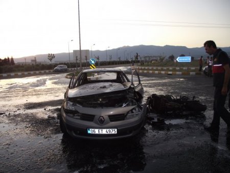 Edremit istikametinden gelen Serkan Türk'ün (36) kullandığı 35 KZK 82 plakalı motosiklet, havaalanı kavşağında tali yoldan anayola çıkan Bekir Yıldırım'ın (71) kullandığı 06 ET 4975 plakalı otomobile çarptı. Çarpmanın etkisiyle motosiklet alev aldı. Alevler otomobile de sıçradı. Yangın, itfaiye ekipleri tarafından söndürüldü.