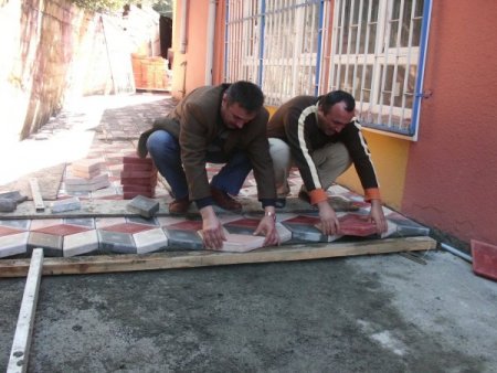 Zonguldak Alaplı Teknik Meslek Lisesi Okul Müdürü Nizamettin Onatoğlu ve Okul Müdür Baş Yardımcısı Süleyman Bayraktar, Kaymakamlık ve esnafların desteği ile alınan parke taşlarını döşüyor.
