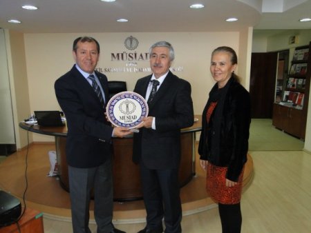 Toplantı sonunda MÜSİAD Şube Başkanı Abdurrahman Çabuk, Prof. Dr. Cüneyt Hoşcoşkun ve Dr. Şükriye Alyanak’a teşekkür ederek derneğin yayınlarını ve çini bir tabak hediye etti. CİHAN