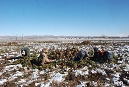 Muş’ta havaların erken soğuması ve kar yağışının aniden bastırması nedeni ile tarlada kalan şeker pancarları kar altından çıkarılıyor. Çiftçiler, eksi 1 derecede tarlada çalışarak pancar sökümü yapıyorlar.