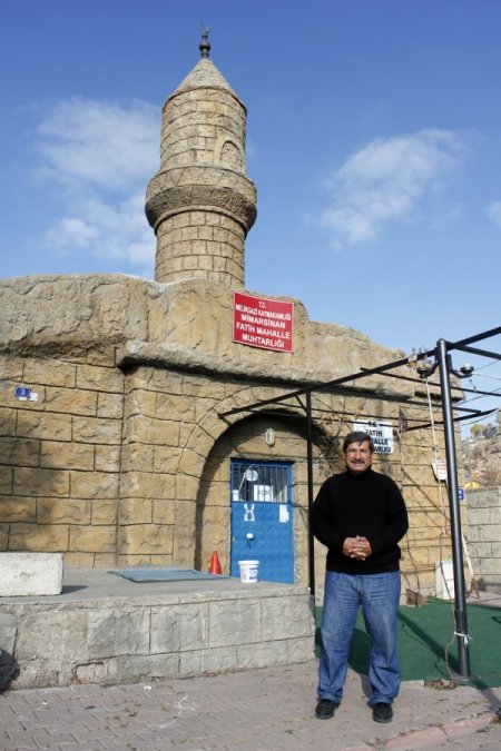 Kayseri’de yol üzerindeki bir parkta minare ve kubbesi bulunan yapıyı görenler, namaz kılmak için durduklarında muhtarlık bürosuyla karşılaşıyor. Görenlerin ilgisini çeken emitasyon yapı, Kayseri-Malatya karayolu üzerindeki Mim-Sin bölgesi civarında bulunuyor.