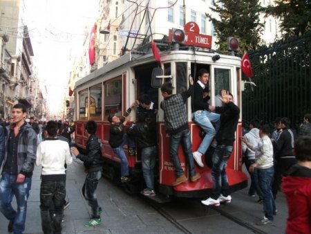 Kurban bayramında İstiklal Caddesi üzerinde yoğunluk yaşanıyor. Özellikle öğleden sonraları yürümekte bile güçlük çekilen caddede Taksim - Tünel arasında sefer yapan nostaljik tramvay tıka basa doluyor. Tramvay’da yer bulamayan ya da bilet vermeden yolculuk yapmak isteyen gençler, ilginç ama bir yandan da tehlikeli görüntüler oluşturuyor.