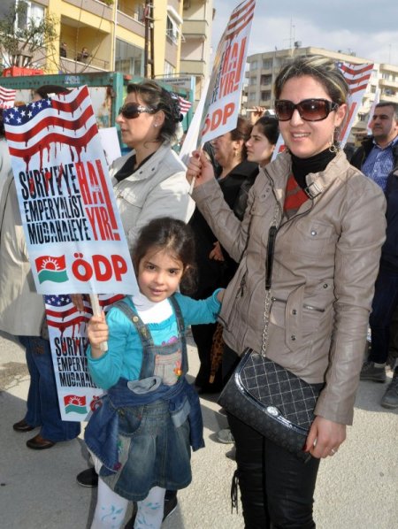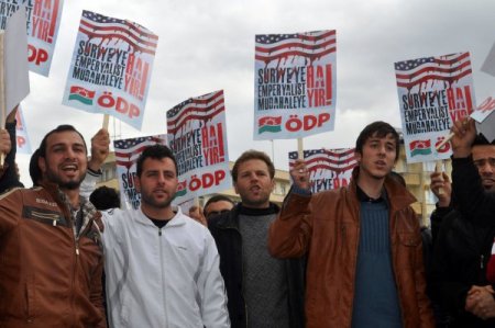 Özgürlük ve Dayanışma Partisi (ÖDP) taraftarları, Antakya’da düzenledikleri 'Suriye'ye Emperyalist Müdahaleye Hayır' eyleminde Beşar Esed posterlerinin açılmasına izin vermedi.