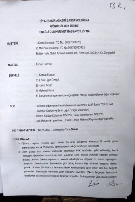 Haber üzerine oğullarının arkadaşı ile görüşen Demirci ailesi, elde ettikleri bilgiler doğrultusunda Ereğli Adliyesi'ne suç duyurusunda bulundu. Adliye çıkışında Cihan Haber Ajansı'na konuşan baba Kamil Demirci (50), “Bugüne kadar çocuğumun teröristler tarafından öldürüldüğünü zannediyorduk. Ama gerçekler öyle değilmiş. Oğlum komutanları tarafından öldürülmüş. Bununla ilgili şahitler de var. Suç duyurusunda bulundum. Suçlular cezasını çeksin” dedi. Baba Demirci savcılığa verdiği dilekçesinde Dönemin Tabur Komutanı H.T., rütbelilerden E.U.Ö, S.K., M.K. ve suça iştirakçi olan şüphelilerden şikayetçi olduğu dilekçesini verdiğini söyledi.