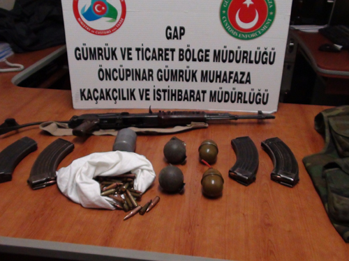 Öncüpınar Gümrük Kapısı’ndan Türkiye’ye giriş yapmak üzere Yolcu Salonu Muayene peronuna gelen, 500571 Suriye plakalı araçtan şüphelenilmesi üzerine Silah-Mühimmat Patlayıcı Dedektör köpeği TOM marifeti ile yapılan aramada, aracın bagajında bulunan battaniyelerin içine gizlenmiş vaziyette 1 adet (82KD1895 seri numaralı) KALEŞNİKOF marka silah ile yine bohça şekline getirilmiş bir battaniyenin içinde bir adet hücum yeleği ve bu yeleğin ceplerinde 4 adet kaleşnikof şarjörü bu şarjörler içinde toplam 120 adet kaleşnikof mermisi,8 adet ayrı şekilde konulmuş kaleşnikof mermisi, 5 adet el bombası (3 adet el yapımı, 2 adet GREENADE marka ) olmak üzere toplamda 1 adet kaleşnikof marka tüfek, 128 adet kaleşnikof tüfek mermisi, 4 adet kaleşnikof tüfek şarjörü, 5 adet el bombası ele geçirilmiştir.