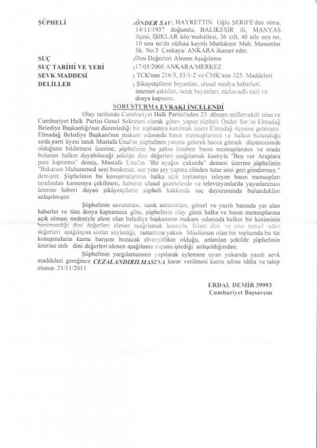 'Dini değerleri alenen aşağılamak' suçlamasının yöneltildiği Önder Sav’ın bu eylemi ile İslam dini ve onu temsil edenleri aşağıladığı, sarf ettiği sözlerin toplumsal barışı bozabilecek ortamı oluşturduğu belirtildi.