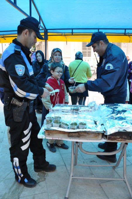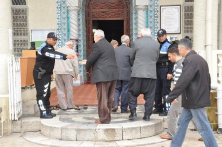 Şehit polisler Mehmet Ali Ünal ve Vahap Alagöz’ün görev arkadaşları vatandaşları cami kapısında gül suyu ile karşıladı.