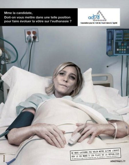 ADMD tarafından hazırlanan ve ötanaziye karşı olduğunu açıklayan Nicolas Sarkozy, François Bayrou ve Marine Le Pen’in hastanede yatarken gösteren montajlanmış afişler haftalık Les Inrockuptibles dergisinde yayınlandı. Afişte "Sayın aday ötanazi konusunda görüşümüzü değiştirmeni için böyle bir resminizi yayınlamamız gerekiyordu." notu da yer aldı.