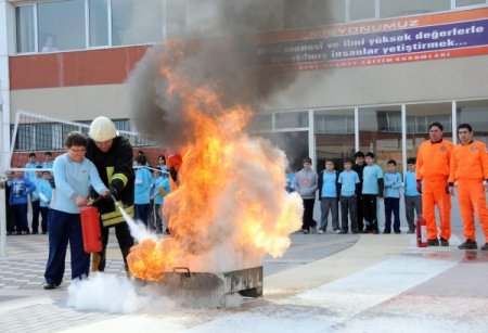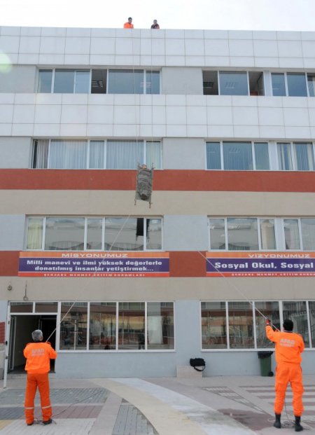 Siren çalmasıyla birlikte öğrenciler, öğretmenlerinin kontrolünde hızlı bir şekilde okulun bahçesine çıktı. Yaralı olarak mahsur kalan öğrenciler, arkadaşları tarafından omuzlarda, sırtta ve sandalyelerde temsili olarak dışarıya çıkarıldı. Bunlara 112 ekipleri müdahale etti. Çatıda mahsur kalan yaralılar ise halatlara bağlanan sedyeyle indirildi. Ayrıca itfaiye ekiplerinin yaktığı ateş, yangın söndürme tüpüyle öğrenciler tarafından söndürüldü.