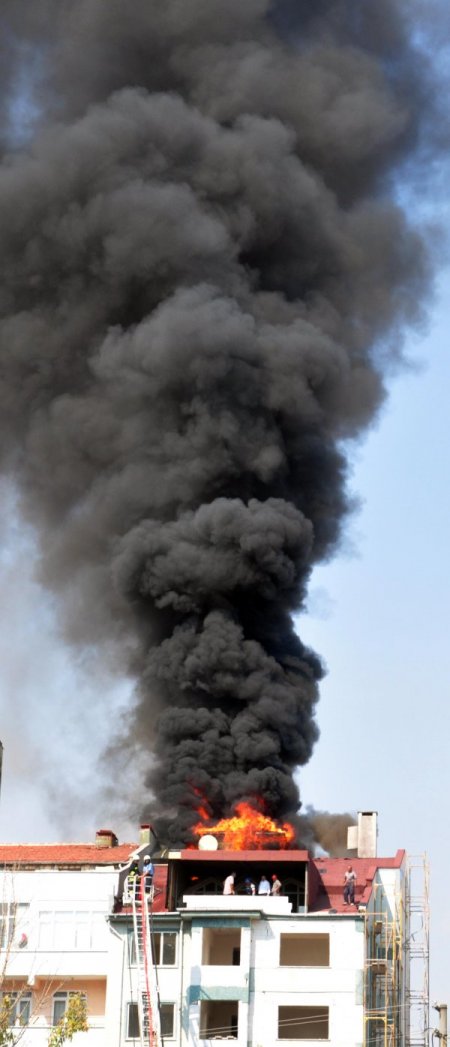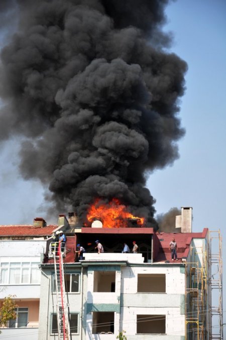 Küçük bir alanda başlayan yangın, itfaiyenin müdahalede yetersiz kalması nedeniyle kısa süre içerisinde tüm çatıyı sardı.