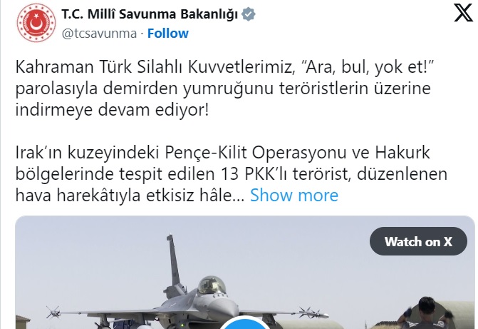 Irak'ın kuzeyindeki Pençe-Kilit Operasyonu ve Hakurk bölgelerinde tespit edilen 13 PKK'lı teröristin, düzenlenen hava harekatıyla etkisiz hale getirildiği belirtilen açıklamada, bölgede tek bir terörist kalmayıncaya kadar operasyonların kararlılıkla süreceği vurgulandı.
