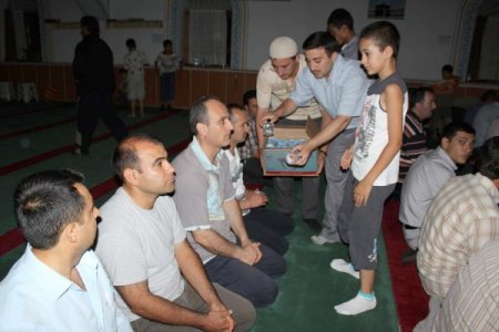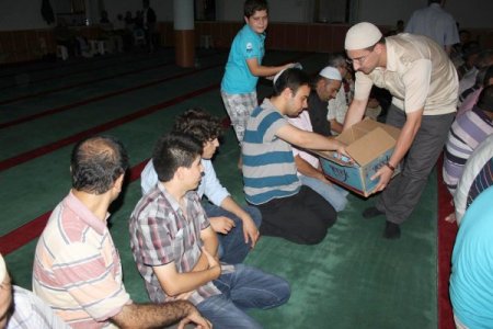 Ankara'nın Polatlı ilçesinde, teravih namazında sıcaktan bunalan cemaate Polatlı İş Adamları Derneği (POLİAD) üyeleri tarafından soğuk su ikram ediliyor.