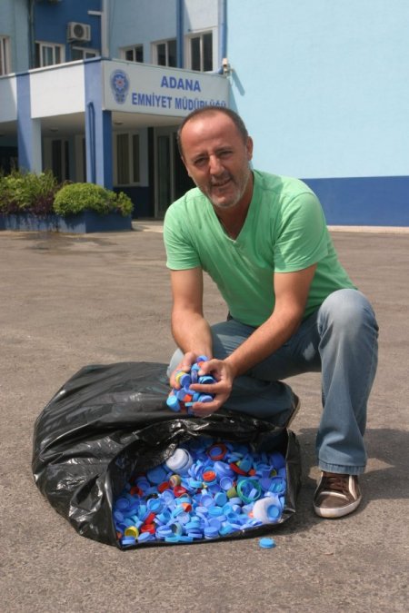 Adana’da, engellilerin tekerlekli sandalye ihtiyacını karşılamak için Ege Üniversitesi Diş Hekimliği Fakültesi tarafından sürdürülen 'Kapakları Toplayalım, Engelleri Aşalım' kampanyasına destek veren 17 yıllık polis memuru Vedat Çelik, dostlarının desteğiyle haftada 50 kilogram pet şişe kapağı toplamayı başardı.