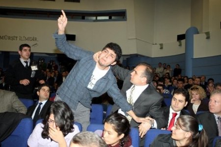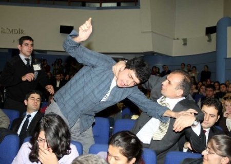 Enerji ve Tabii Kaynaklar Bakanı Taner Yıldız, kendisini proteste eden öğrenciyi yanına oturtup sohbet etti. Korumaların müdahalesine kadar öfkeli ve gergin olan genç, Bakan Yıldız’ın yumuşak tavrı karşısında ne yapacağını şaşırdı. Konuşmasının ardından Bakan Yıldız ile birlikte salondan kol kola ayrıldı. Gazi Üniversitesi 100. Yıl Konferans Salonu'nda ‘Nükleer Enerji'nin Geleceği ve Hukuki Sorumluluk’ konulu panelde konuşan Yıldız, konuşmasının sonuna doğru bir öğrencinin protestosuyla karşılaştı. Üniversite öğrencisi Nesime Yiğit Eryılmaz’ın protestosu üzerine korumalar hemen müdahale etti. Öğrenciyi susturan korumalar ve özel güvenlik görevlilerine tepki gösteren Bakan Yıldız, kendisini protesto etmek isteyen Eryılmaz’ı kürsüye çağırıp yanına oturttu. Öğrencinin gözyaşları içinde konuşmasına izin veren ve yanına oturan Bakan Yıldız, Gençlik Birliği üyesi olduğunu söyleyen öğrenciye içine dökmesini söyledi. Korumalarla yaşanan itiş kakışta yakası bozulan öğrencinin yakasını düzelten Yıldız, öğrenciye karşı sakin tavırlarıyla salondan alkış aldı. Yan yana oturan Bakan ve eylemci öğrenci Eryılmaz, konuştu. Eryılmaz, Bakan Yıldız’a “Hiç kimse 17-18 saat çalıştırılamaz. Düne kadar Suriye ile dostken ne oldu da düşman oldular. Bakana demokrasiden dolayı teşekkür ederim.” dedi. ÖĞRENCİYİ BAKANLIĞA DAVET ETTİ Karşılıklı konuşmaların ardından salonu tek başına terk etmek isteyen protestocu öğrenciyi, "Nesime dur dur nereye gidiyorsun. Beraber çıkacağız salondan” deyip geri çevirdi. Ardından Bakan Yıldız ve protestocu öğrenci kol kola salondan dışarı çıktı. Bakan Yıldız öğrenciyi Enerji Bakanlığı'na ziyaretine davet etti. Öğrenci de "Uğrarım birgün" karşılığını verdi. Gençlik Birliği üyesi olduğunu belirten Yiğit Eryılmaz, güvenlik güçleri tarafından gözaltına alınmadı. Dışarıda da basın mensuplarına açıklama yaptı. CİHAN