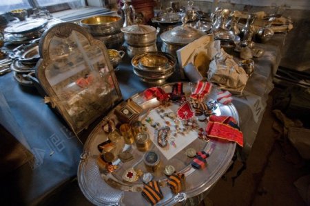 Üzerlerinde Çarlık Rusya’sının soylularından “Narışkin” ailesine ait armalar bulunan hazinede, çatal, tabak, kaşık gibi mutfak eşyaları, özel işlemeli semaverler, cep saatleri ve vazo gibi değerli eşyalar bulunuyor.