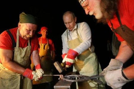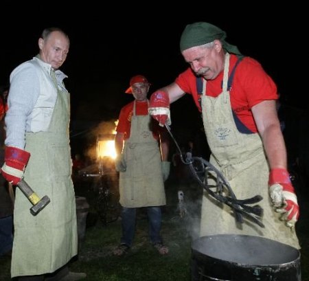 Rusya'nın İrkutsk bölgesinde Talsti etnografya müzesini ziyaret eden Putin, nalbant önlüğünü giyerek eline aldığı çekiçle körüklenmiş demirleri dövdü, parçaları birleştirdi. Kızgın demirin suda soğutulmasını izleyen Rusya Başbakanı, hayli neşeli idi.