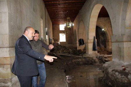 Belediye Başkan Yardımcısı Selahattin Kondolot ve Fen İşleri Müdürü Raif Kalekahyası ile birlikte Ulu Camii’nde yapılan çalışmaları inceleyen Polat, tadilat aşamasında giderilecek problemler hakkında yetkilerden bilgi aldı.