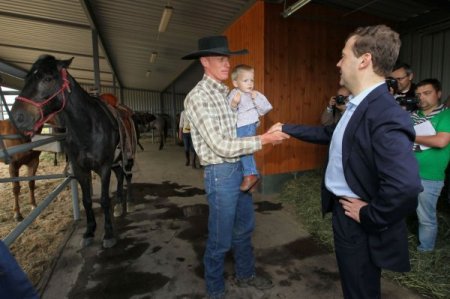 Eşi ve küçük oğlu ile birlikte çiftlikte çalışmaya gelen Amerikalı kovboyla sohbet eden Medvedev, Rusça öğrenip öğrenmediğini sordu. Kovboy da sığırların bakımı için gerekli olan “kapıyı aç”, “kapıyı kapat” ya da “teşekkür ederim” gibi birkaç kelime öğrendiğini ifade etti.