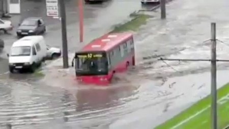 Rusya'ya bağlı Tataristan Cumhuriyeti'nin başkenti Kazan'da bir otobüsün, biriken yağmur sularının arasından inatla çıkması ilginç görüntülere sahne oldu.