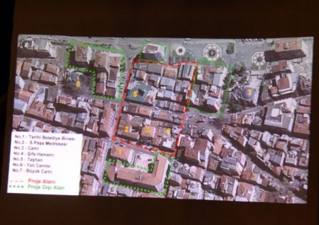 Yücel Türe ve beraberindekiler, toplantıda ayrıca, slayt eşliğinde Saathane Meydanı’nda yıkım yapmadan yapılabilecek alternatif çalışmaları ve Türkiye’de restorasyon yapılan bu tip benzer tarihi yerleri gösterdi.