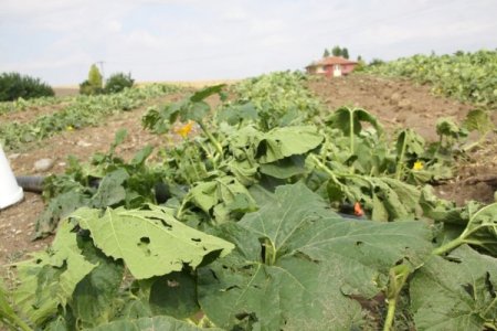 Özden, 750 hektarlık verimli tarım arazisini etkileyen yağışla birlikte fırtınanın tarlalardaki salatalık, fasulye domates ve karpuz sebzelerine büyük zayiat verdiğini söyledi.
