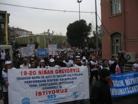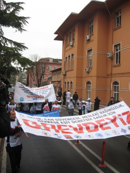 Sağlık Sosyal Hizmet Sendikası ile İstanbul Tabip Odası'nın koordineli olarak organize ettiği iş bırakma eyleminde "Emekçiyiz haklıyız kazanacağız, hastanelerimiz kapatılmak satılmak isteniyor, insanca çalışmak istiyoruz" yazılı pankartlar taşıdı.