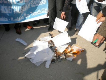 Sağlık -Sen Hatay Şubesine bağlı sağlık çalışanları Antakya Devlet Hastanesi önünde maaş bordrolarını yakarak hükümeti protesto etti.