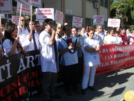 Açıklamanın ardından sağlık çalışanları acil servis önünden yürüyüşe geçti. Başhekimlik önüne gelen sağlık çalışanları yürüyüş boyunca ‘Şiddete hayır herkese sağlık’ , ‘Herkese sağlık güvenceli gelecek’ , ‘Sağlık haktır satılamaz’ , ‘Sağlıkta ticaret ölüm demektir’ , ‘Güvenceli iş güvenceli gelecek istiyoruz’ , ‘Doktor hasta düşmanı değildir’ şeklinde sloganlar attı.