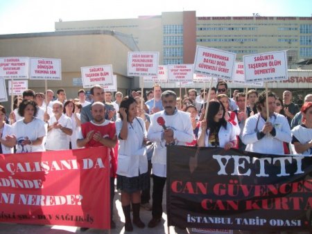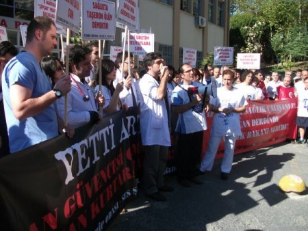 Sağlık çalışanlarına yönelik şiddeti protesto eden Okmeydanı Eğitim ve Araştırma Hastanesi’nde bir grup sağlık çalışanı, yarım günlük iş bırakma eylemi yaptı. Saat 11.00’da Acil Servis önünde toplanan yaklaşık 100 kişilik grup, ‘Yetti artık.Can güvencesi olmayanlar can kurtaramaz’ , ‘Hasta da sağlık çalışanı da can derdinde. Sağlık Bakanı nerede?’ yazılı pankartlar ile ‘Sağlıkta taşeron ölüm demektir’ , ‘Hasta da hekim de can derdinde’ , ‘5 dakikada şipşak muayneyi dayatanlar utansın’ , ‘Sağlıkta dönüşüm yıkımına son’ yazılı dövizler açtı.