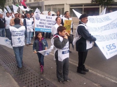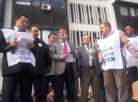 Sabah saatlerinde hastanelerle bazı belirli yerlerde toplanan sağlık çalışanları, Konak Meydanı'ndaki Büyükşehir Belediyesi önüne kadar yürüdü. Burada slogan atılması ve basın açıklaması yapılmasının ardından eylem, Büyükşehir operasyonu protestosuna dönüştü. Operasyonda gözaltına alınanlardan DİSK Genel Yönetim Kurulu Üyesi Cafer Konca lehine sloganlar da atıldı. "Karanlığa teslim olmayacağız", "Direne direne kazanacağız", "AK Parti sağlığa zararlı" şeklinde sloganlar atan kalabalık, İzmir Büyükşehir Belediyesi'ne yönelik operasyonları, KCK ve Ergenekon davalarını da protesto etti. Kamu Emekçileri Sendikaları (KESK) İzmir Şubeler Platformu temsilcileri adına açıklamada bulunan KESK Hukuk, TİS ve Uluslararası İlişkiler Sekreteri Ali Kılıç, Meclis'te onaylanmayı bekleyen bütçede, insanca yaşamak isteyenlere hak tanınmadığını iddia etti. Sağlığın vazgeçilmez temel haklar arasında yer aldığını vurgulayan Kılıç, "IMF'nin talimatıyla Yeşil Kart uygulamasının bir hafta sonra bitirilmesiyle 5 milyon insanımız sağlık güvencesinden, asgari ücretin üçte birinden fazla gelire sahip olup SGK primi ödemeyenler de muayene hakkından yoksun kalacak." dedi.