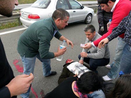 TEM otoyolu İstanbul-Ankara istikameti Sapanca Yüzevler Mevkii’nde seyreden 34 HA 7699 plakalı motosikletli kurye Şahin Yaşar (38), aynı istikamette arıza yapan aracına bakan 34 AV 676 plakalı araç sürücüsü Özcan Gürbay (41) ve aracına çarptı. Yaşar, çarpmanın etkisiyle motosikletten yola savruldu. İki sürücü de yaralandı.