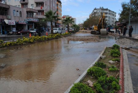 İçme suyu şebeke borusu patlayınca Antalya Manavgat Belediyesi'nin Hastane Caddesi'nde yaptığı yol yapım çalışmaları sekteye uğradı.