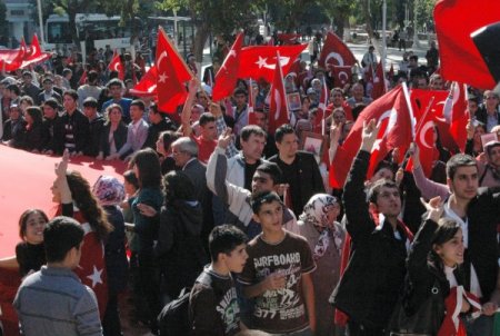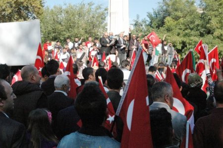 Kırkayak Parkı’nda toplanan yüzlerce vatandaş, sloganlar atarak Yeşilsu Parkı’na yürüdü. Burada toplanan şehit aileleri, gaziler ve vatandaşlar, şehitlerin anısına saygı duruşunda bulunup, İstiklal Marşı okudu. Saldırılarda şehit düşen askerlerin de isminin okunduğu protesto gösterisinde, kalabalık hep bir ağızdan ‘burada’ diyerek karşılık verdi.