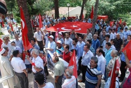 Türkiye Kamu-Sen üyesi grup, öğle namazı sonrası Ulu Camii'nde şehitler için cenaze namazı kıldıktan sonra sloganlar eşliğinde Pınarbaşı Şehitliği'ne yürüdü.