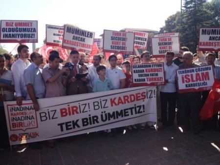 Geçtiğimiz günlerde Gaziantep’te meydana gelen patlamada 9 vatandaşın şehit olması ve son günlerde terör saldırıları üzerine Saadet Partililer Sultanahmet Camii’nde mevlit okuttu. Okunan Kuran-ı Kerim’in ardından partililer Sultanahmet Camii önünde protesto gösterisinde bulundu. ‘Müslümanlar kardeştir’, şeklinde slogan atan grup, ‘Türk de secdede, Kürt de secdede’, ‘Selahaddin Eyyubi kadar Kürt’üz, Sultan Fatih Kadar Türk’üz’, ‘Müminler ancak kardeştir’, ‘Terörün çözümü İslam kardeşliği’, ‘Biz biriz, biz kardeşiz, tek bir ümmetiz’ yazılı pankart ve döviz taşıdı. Sık sık tekbirler getiren grup adına açıklamayı Saadet Partisi İl Gençlik Kolları Başkanı İsmail Acar yaptı.