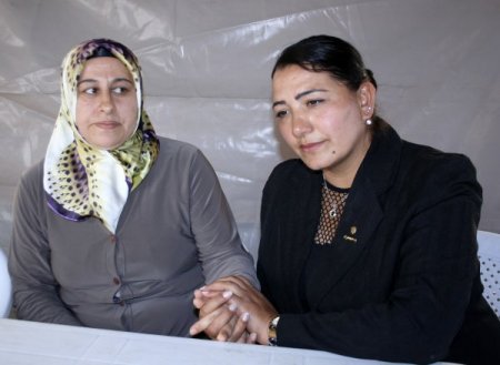 Şehit eşi İnce Kılıçaslan (solda), Van'daki depremzedeler için yardım kampanyası başlattı. Kılıçaslan, yardımları taziye çadırında kabul ediyor. Mahalle Muhtarı Kiraz Genç (sağda), şehit eşini yanlız bırakmıyor. CİHAN