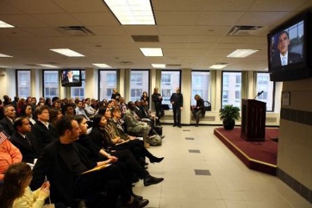 Göçmenlik merkezinde her cuma yapılan yemin töreni tam anlamıyla sıra dışı bir manzara. Geçtiğimiz cuma günü gerçekleşen yemin töreninde 52 ülkeden 154 kişi yemin ederek ABD vatandaşı olmuş. Aralarında hiçbir Türk'ün olmadığı yemin töreninde ailece Amerikan vatandaşı olanlar da vardı. Listenin en başında 21 kişi ile Dominik Cumhuriyeti vatandaşları yer alırken 7 Arnavut, 8 Jamaikalı, 8 Hindistanlı, 6 Pakistan ve Çinli yemin ederek Amerikan vatandaşı oldu. Yemin törenine çocuklarıyla gelenler gözle görülür oranda fazlaydı. Birçoğu bu ülkede doğan ve doğal olarak Amerika vatandaşı olan çocuklar, anne ve babalarının yemin ederek ABD vatandaşı olmalarına şahit oldu. Resmi yetkilinin söylediklerini hep bir ağızdan sağ ellerini kaldırarak yemin eden yeni Amerikan vatandaşları, ellerindeki ABD bayraklarını sallayarak mutluluklarını aileleriyle paylaştı. Eşiyle birlikte yemin eden Kosovalı İsmet Şala, 10 yıldır Amerika'da olduğunu belirterek, "Amerika dünyanın en büyük ülkesi. Gerçekten çok mutluyum. İşlemlerim başvurduktan 3 ay sonra sonuçlandı. İki çocuğum var onlar zaten burada doğdular, doğal olarak Amerikan vatandaşılar. Tahminime göre Kosova vatandaşlığımı da elimde tutabiliyorum. Kosova'nın çok yeni bir anayasası var tekrardan kontrol etmem gerekiyor. Bu ülke gerçekten büyük bir ülke." ifadelerini kullandı. Yemin ederek ABD vatandaşı olan bir diğer kişi ise Bangladeş kökenli Uttom Şaha'ydı. 18 yıldır Amerika'da olduğunu söyleyen yeni Amerikalı, "Bu ülkeyi seviyorum. Bu ülkenin özgürlük anlayışını seviyorum. Karım sayesinde yeşil kartımı almıştım şimdi de vatandaş oldum. Bangladeş'te her şey daha zor." diye konuştu. Program Başkan Barack Obama'nın mesajının dinlenmesiyle ve bol bol hatıra fotoğrafının çekilmesiyle son buldu. Göçmenlik bürosu, 11 Eylül saldırılarının ardından Yurtiçi Güvenlik Bakanlığı'na (Homeland Security) bağlanarak üç ayrı birim altında hizmet vermeye başlayan devasa bir merkez. Kaçakların yakalanması ve sınır dışı edilmesinden gümrüklere kadar birçok bölge USCIS'in sorumluluğunda. Son bir kaç yıl içinde işlemleri elden geldiğince hızlı hale getirmek için büyük yatırımlar yaptıklarını anlatan bölge direktörü Andrea J. Quarantillo, en çok önem verdikleri konunun "doğru karar" vermek olduğunu vurgulayarak şunları söyledi: "Son bir kaç yılda yapılan işlemlerin daha kısa sürede sonuca bağlanması için uğraşıyoruz. New York olarak en yoğun uğraştığımız iki konu var; vatandaşlık, Yeşil Kart başvuruları ve statü değişiklikleri. Vize statüsünü değiştirmek isteyen ya da süresini uzatmak isteyen 35 ile 50 bin arasında değişen dosyaya biz bakıyoruz. Her yıl Yeşil Kart ve vatandaşlık işlemleriyle alakalı da 80 ile 100 bin arasında dosyayla da biz ilgileniyoruz. Dosyanın büyüklüğü ya da küçüklüğünün hiçbir önemi yok. Beş ayda tüm dosyaları sonuca ulaştırarak vatandaşlara cevap veriyoruz. Bir diğer üzerinde durduğumuz konu ise şeffaflık. Verilen kararların nedeninin herkes tarafından anlaşılmasını istiyoruz. Bu yüzden dosyalarımızı; ne oldu, ne olacak şeklinde düzenliyoruz. Ne yaptığımızı, nasıl yaptığımızı ve niçin yaptığımızı herkese anlatıyoruz."