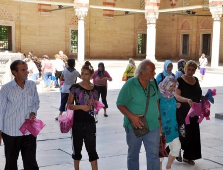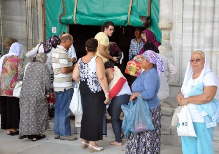 Dışarıdan gelen insanların camii hizmeti olarak tahmin ettiği poşetler için sonrasında para isteniyor.
