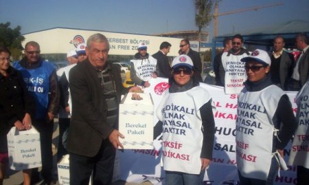 Türkiye İşçi Sendikaları Konfederasyonu 3. Bölge Temsilciliği, Türkiye Tekstil, Örme ve Giyim Sanayi İşçileri Sendikası (TEKSİF)’nın İzmir’in Gaziemir ilçesindeki Ege Serbest Bölgesi’de bulunan Hugo Boss fabrikasından atılan sendikalı 18 ve Menemen ilçesindeki Savranoğlu adlı işyeriden atılan Deri-İş Sendikası'na bağlı 44 işçiye erzak paketi verdi.