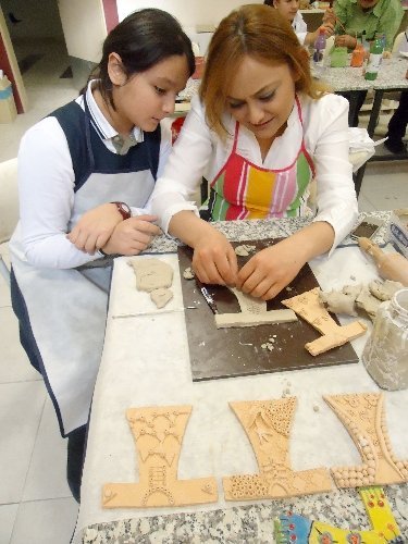 Gaziantep’te Özel Cahit Nakıboğlu Koleji’nin öğrencileri, Görsel Sanatlar dersinde öğretmenden öğrendikleri seramikten motifleri annelerine öğretiyor.