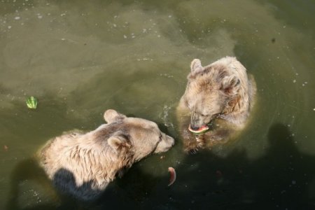 Eylül ayına girilmesine rağmen etkisini sürdüren sıcak hava, Bursa'da ki hayvanat bahçesinde bulunan hayvanları da etkiliyor. Büyükşehir Belediyesi Bursa Hayvanat Bahçesi (Zoo Park)'ta bulunan hayvanlar sıcak havada hem serinleme hem de mevsim meyvelerinden yeme imkanı buluyor. Yetkililer, parkta bulunan deve ve lamaları hortumla sulayarak serinletirken, maymunlara çerez, aslanlara ise tavuk ve et verdiklerini belirtti. Parkın en çok ziyaret edilen havanlarından olan ayılar ise havuzla çevrili alanda kendilerine verilen karpuz ve kavunla besleniyor. Alanda bulunan 4 ayı, kendilerine verilen karpuzlarla hem yaz meyvelerini yemiş, hem de serinlemiş oluyor. Öğle sıcağında ayılara kapuz getiren görevliler önce ikiye ayırdıkları karpuzları ayılara atıyor. Karpuzların dağılmaması için havuz içine atan görevliler ayıları isimleri ile çağırarak karpuz yemelerini sağlıyor. Karpuz saatinin geldiğini anlayan ayılar sıra ile girdikleri havuzda karpuzları kapma yarışına giriyor. Karpuzları kapmak için birbiri ile atışmaktan çekinmeyen ayılar, görevliler tarafından atılan karpuzları havada kapmaktan da geri durmuyor. Atılan karpuzları havuz içinde ön pençeleri ile tutarak iştahla yiyen ayılar, ziyaretçilerine de unutulmaz bir seyir zevki sunuyor. Özellikle çocukların büyük ilgisini çeken ayılar, şaşkın bakışlar arasında karpuzlarını yedikten sonra çekildikleri ağaç gölgelerinde dinleniyor.